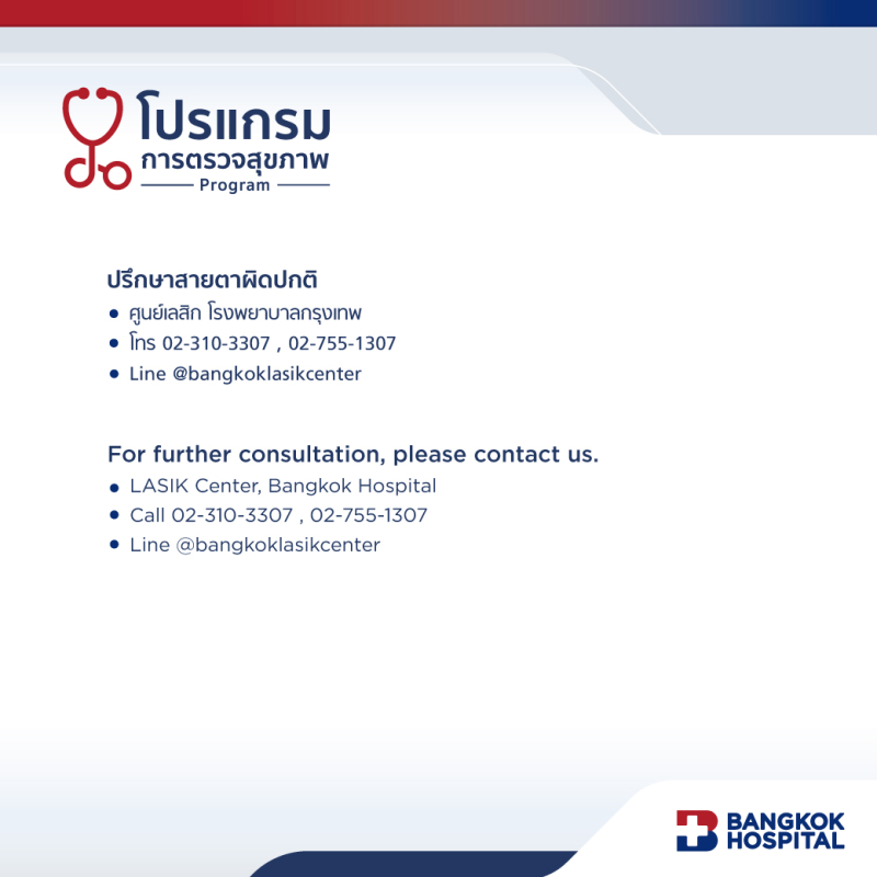 9. For further information or to schedule an appointment , please contact LASIK Center, 5th floor, D Building, Bangkok Hospital. Available every day from 8:00 AM to 4:00 PM. Please call 02 755 1307, 02 310 3307, or 1719.
