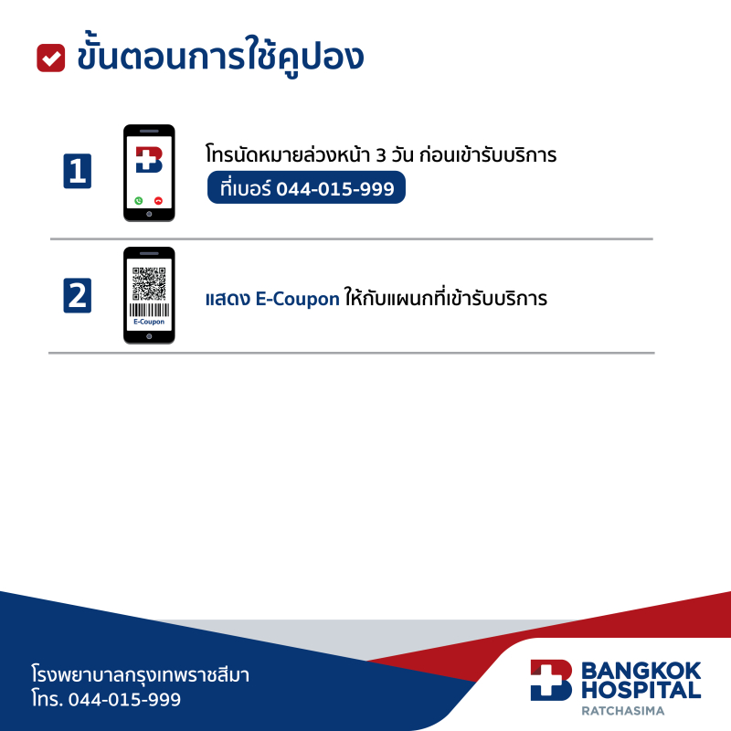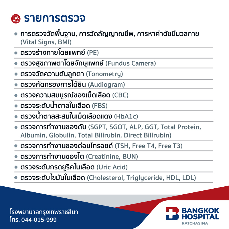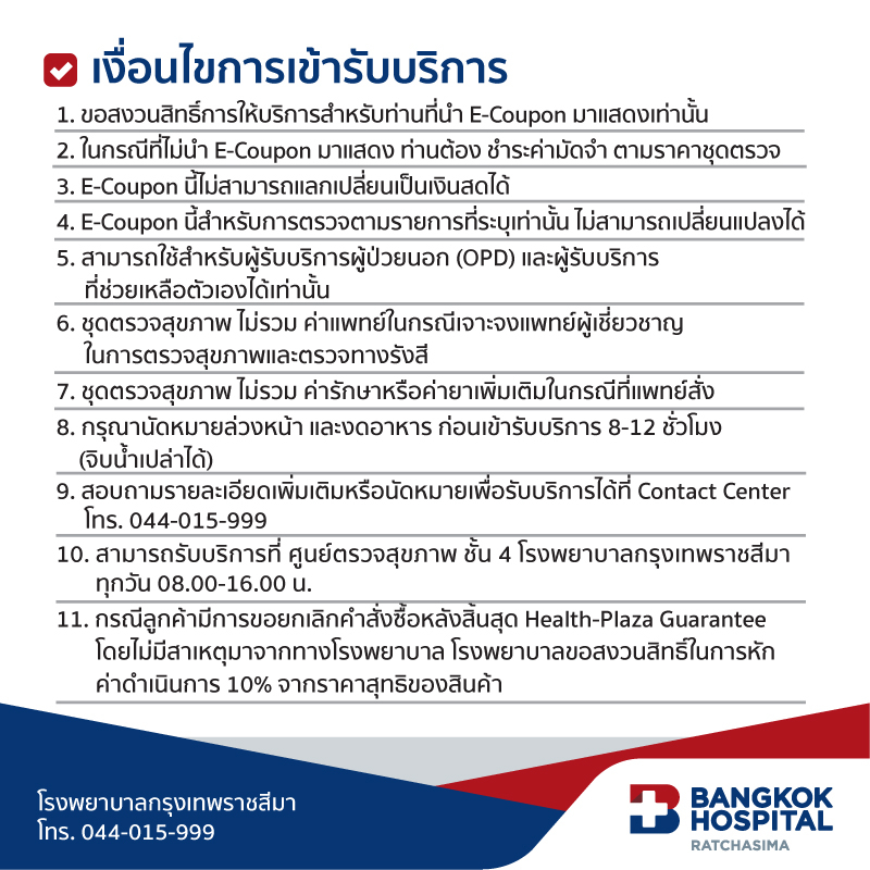 10. สามารถรับบริการที่ ศูนย์ตรวจสุขภาพ ชั้น 4 โรงพยาบาลกรุงเทพราชสีมา ทุกวัน 8.00 – 16.00 น.