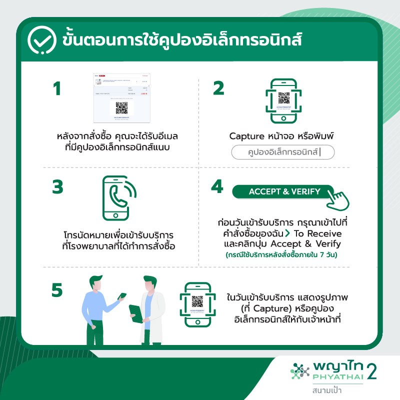 - กรุณากรอกรายละเอียดของท่านใน link ที่แนบมาใน E-Coupon ที่ท่านจะได้รับผ่าน e-mail หลังสั่งซื้อสำเร็จ เพื่อเป็นข้อมูลให้กับเจ้าหน้าที่ ก่อนท่านจะเข้าใช้บริการที่โรงพยาบาลพญาไท 2