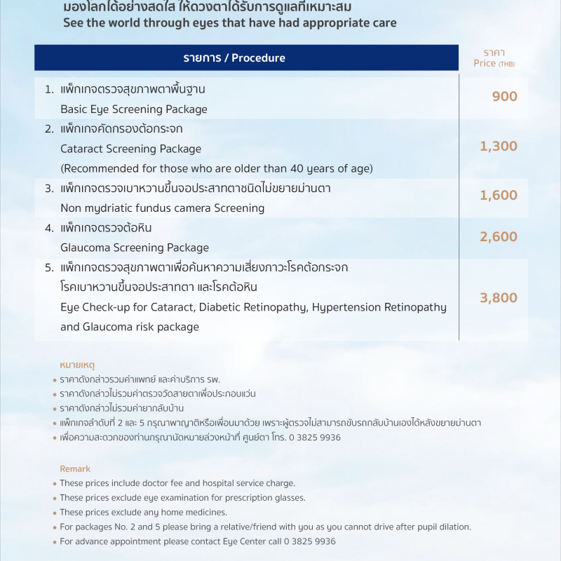 • เพื่อความสะดวกของท่านกรุณานัดหมายล่วงหน้าทื่ ศูนย์ตา โทร. 0 3825 9936