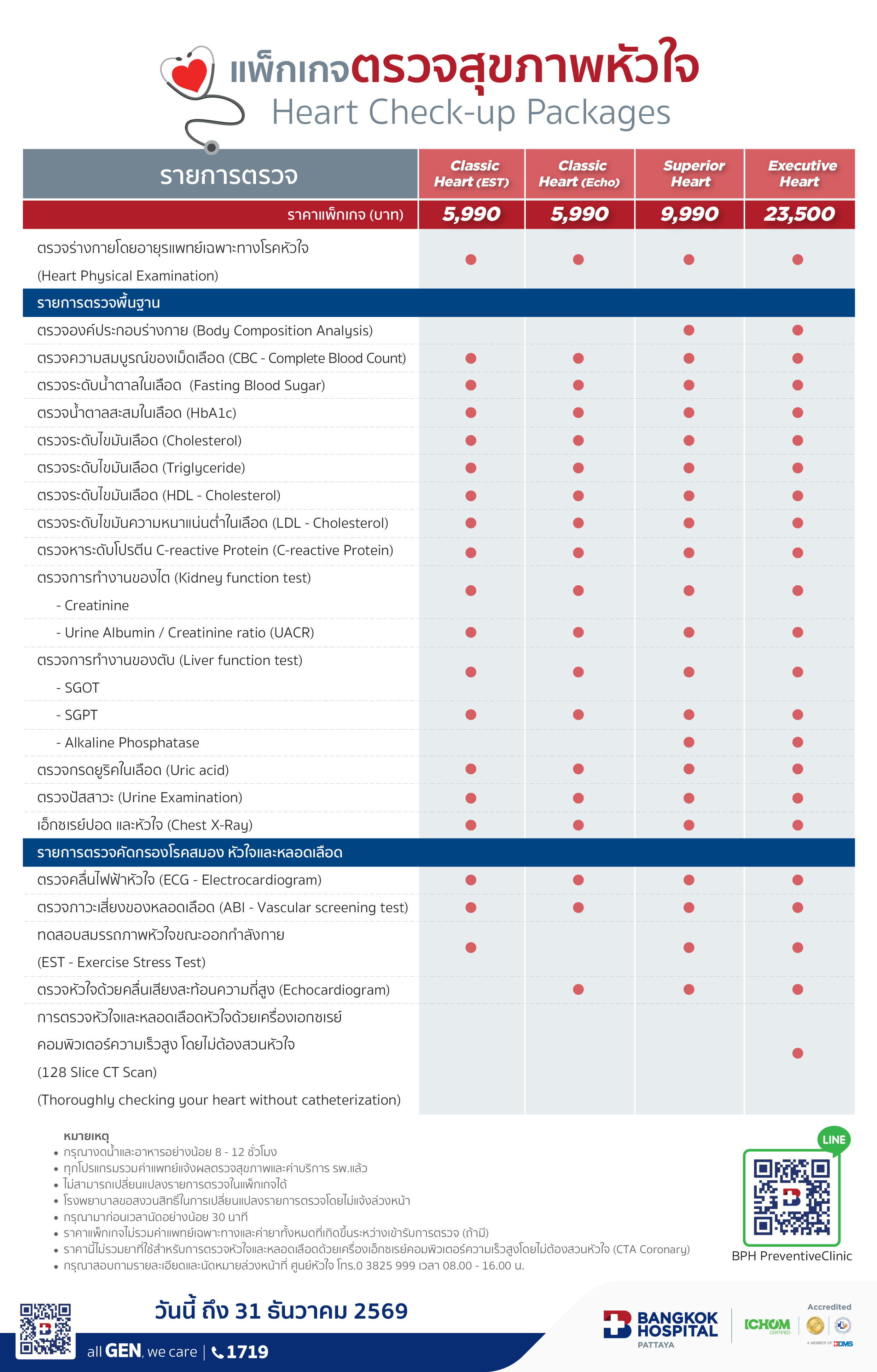 (โรงพยาบาลกรุงเทพพัทยา) แพ็กเกจตรวจสุขภาพหัวใจ Classic Heart (EST)