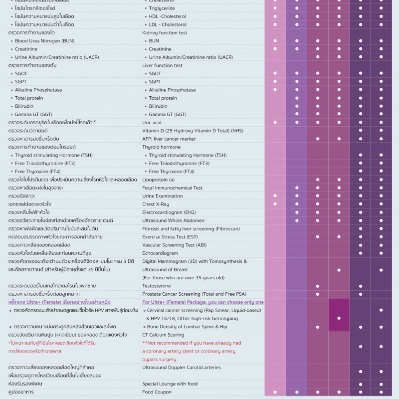 • การตรวจสุขภาพมีวัตถุประสงค์เพื่อคัดกรองและประเมินความเสี่ยงของโรค ไม่ได้ใช้แทนการตรวจวินิจฉัยในกรณีที่มีอาการผิดปกติ หากมีข้อสงสัย แนะนำปรึกษาแพทย์เพื่อการดูแลที่เหมาะสม