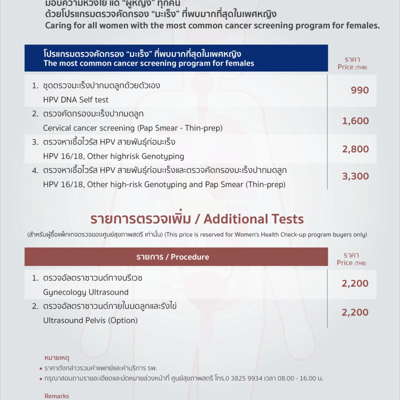 •กรุณาสอบถามรายละเอียดและนัดหมายล่วงหน้าที่ ศูนย์สุขภาพสตรี โทร.0 3825 9934 เวลา 08.00-16.00 น.