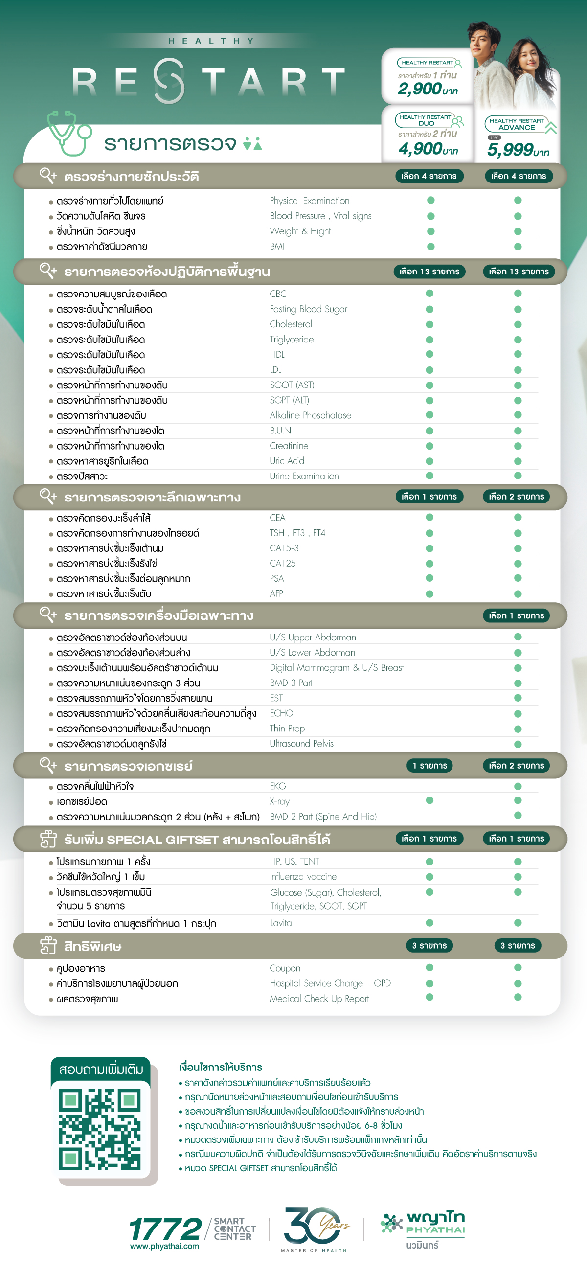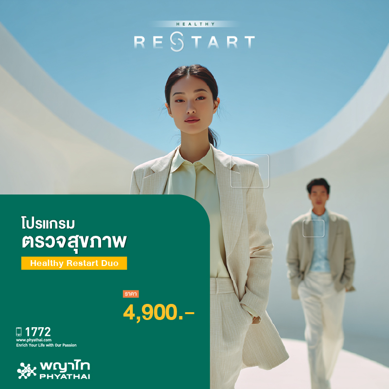 Healthy Restart สุขภาพของคุณ อัปเดตได้เหมือนอัปสตอรี่ ทุกช่วงเวลาคือโอกาสในการเริ่มต้นใหม่ โปรแกรม Healthy Restart ถูกออกแบบมาเพื่อให้คุณได้เช็กสุขภาพอย่างลึกซึ้ง รู้เท่าทันความเปลี่ยนแปลงของร่างกาย และวางแผนการดูแลได้เหมาะกับจังหวะชีวิตของคุณอีกครั้ง เพราะสุขภาพที่ดี…คือเรื่องราวที่ควรอัปเดตอยู่เสมอ เพื่อให้ทุกวันเริ่มต้นได้อย่างมั่นใจ และเต็มไปด้วยพลังอีกครั้ง